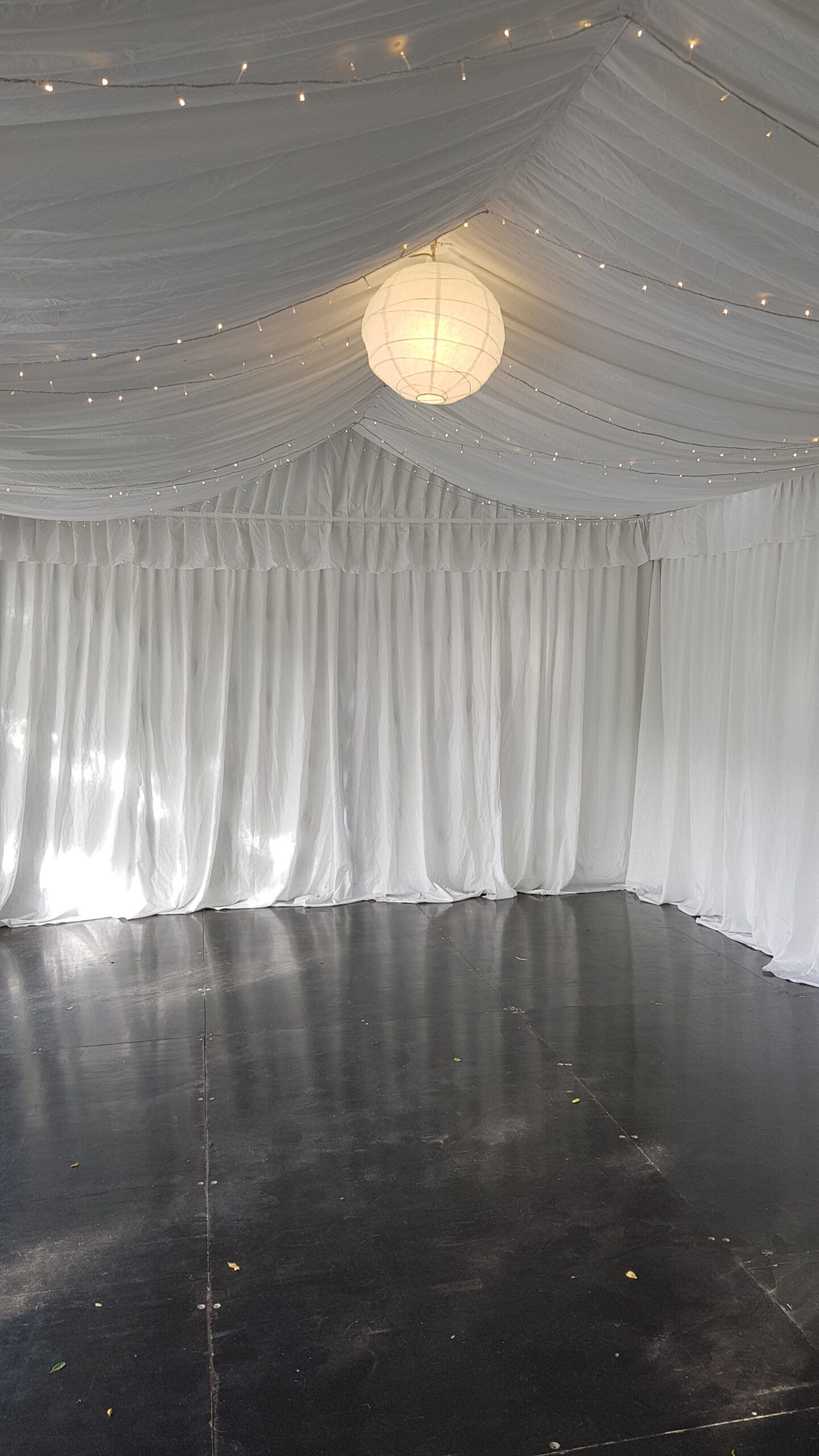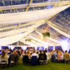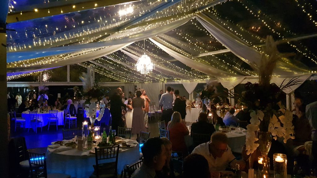 A magical wedding reception setup by Australian Hiring Company in Adelaide, featuring a transparent marquee with fairy lights, chandeliers, and elegantly dressed tables where guests enjoy an unforgettable evening.