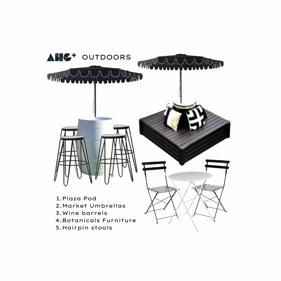 • Market Umbrellas: Elegant black scalloped-edge umbrellas with white trim for shaded comfort.